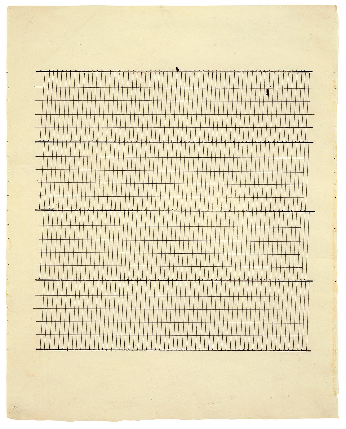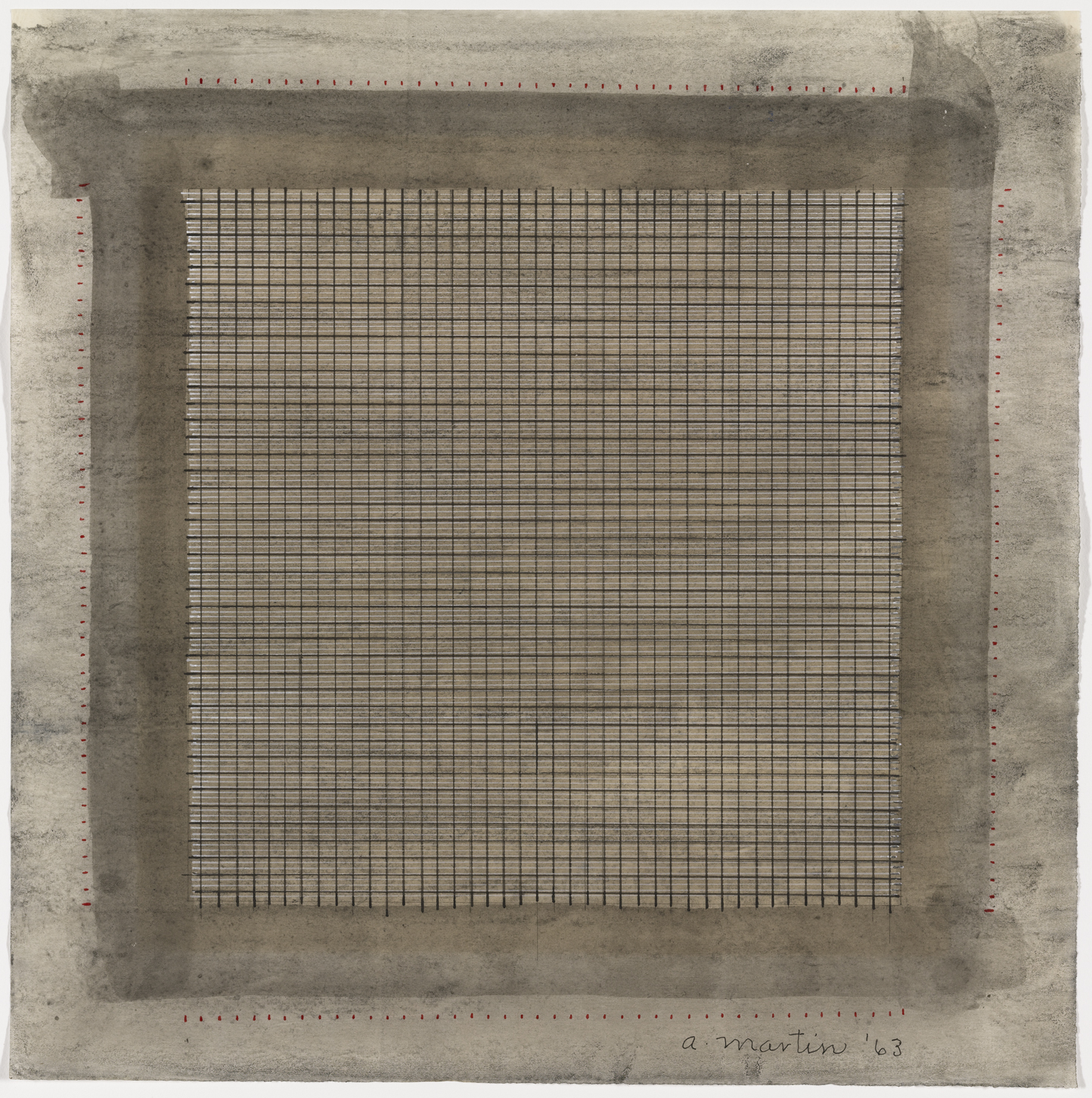 The tension between the rigid system of the grid and the graphic variations permitted by Martin’s subjective choices and treatment of line becomes more complex in Wood I (1963; fig. 2). Here she overlaid in pencil a square grid on top of a thin black wash with subtle irregularities in tone and texture. Behind the graphite grid and over the wash, she also drew a patterned series of faint white horizontal lines. These lines generate an optical vibration in the graph, which is bound by dark, casually applied bands of wash extending beyond the parameters of the square.1