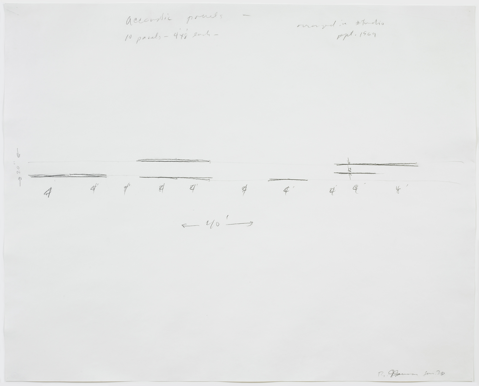 Bruce Nauman’s drawing acoustic panels / 10 panels—4′ x 8′ each / arranged in studio / sept. 1969 (1970; fig. 1) delineates a sculpture comprising ten upright panels staggered in parallel rows across a room. The bare, schematic drawing reflects a hasty informality. Mistakes are not erased or hidden—words are misspelled (“accoustic”), and Nauman casually jotted the accurate “4-foot” measurement over the incorrect “8-foot” notations. He also superimposed precise lines drawn with a straightedge upon his preliminary gestural lines. Such corrections offer insight into the artist’s visual thinking, specifically into his view of art as a creative process of trial and error rather than a resplendently crafted product of divine genius.