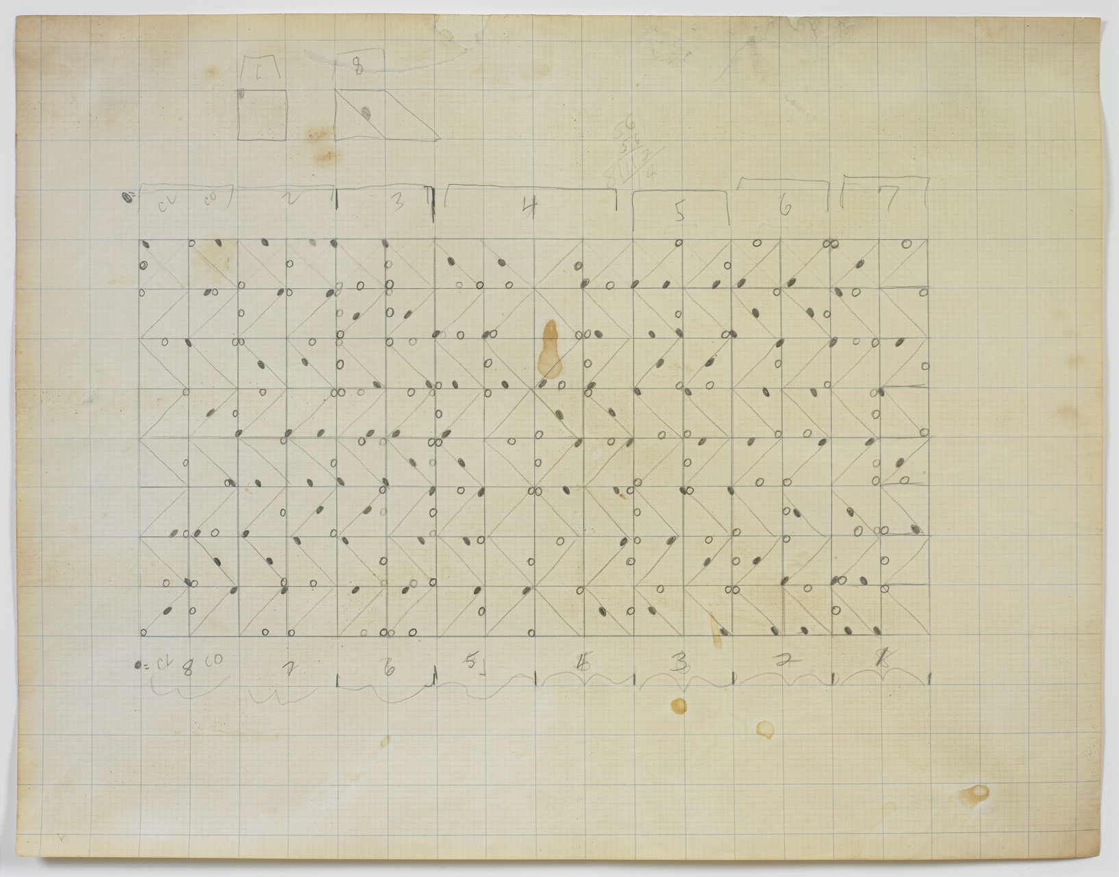 At art school in the 1950s, Poons was convinced that he could not draw: “I tried. But I found a way—or it found me, I suppose—where if I didn’t look at the paper, and didn’t look at what my hand was doing, and just looked at what I was drawing, I could do it much better than I’d ever done before.”1 He began organizing fields of dots and ellipses on a precise mathematical grid like the one in the present drawing, calculating not only the exact position that the shapes would occupy on the painted canvas but their optical trajectory for the viewer as well. The drawing is squared on graph paper, with the field of the projected painting divided into numbered sections along its upper and lower horizontal axes. Each square is neatly bisected by a diagonal line, alternating in direction with the lines above and below it to create a zigzag pattern. These lines would not be visible in the final painting, but their pattern is indicated by solid elliptical dots. Pointing along the diagonals, the lines of dots add to the directionality of the composition and to its sense of movement. Their shapes are interspersed, seemingly at random, with open circular dots situated on the horizontal and vertical axes of the grid. When transferred to canvas, the precisely positioned dots create the effect of an alternate pattern of movement, generating an optical illusion of space through the interaction of the two shapes, ellipse and circle. The presence of faint pencil lines, as well as smudges and what may be coffee stains on the sheet, reinforces the drawing’s status as a working diagram for a finished painting.