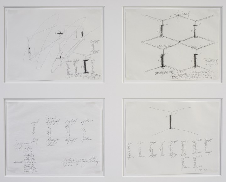 Flavin recorded his ideas for artworks in notebooks that he carried everywhere, sketching layouts and annotating them extensively with technical details. These constituted his primary creative input into the final installations, which were ultimately executed by technicians. In contrast to his detailed and specific working drawings, the end products, constructed of store-bought materials, de-emphasized any physical intervention on the part of the artist. Flavin underlined the importance of drawing to his work in 1973, the year he made these sketches: “I have come to understand that, for me, drawing and diagramming are mainly what little it takes to keep a record of thought…. Within my reciprocating system for fluorescent light such continuous retention is constantly required.”1