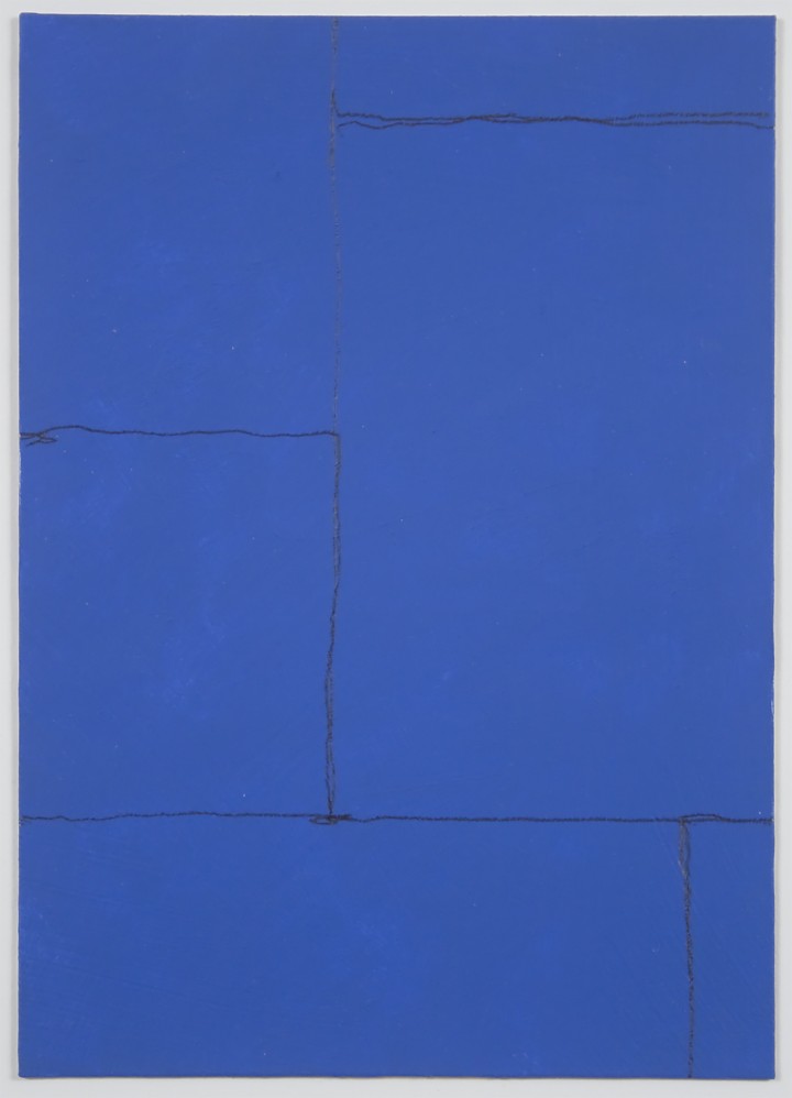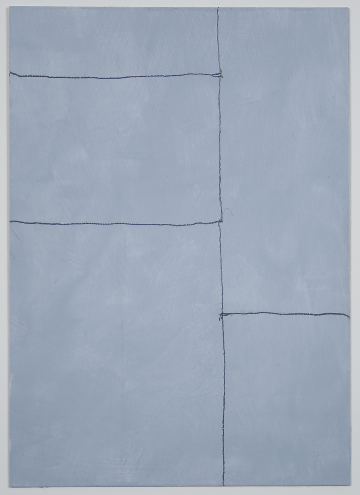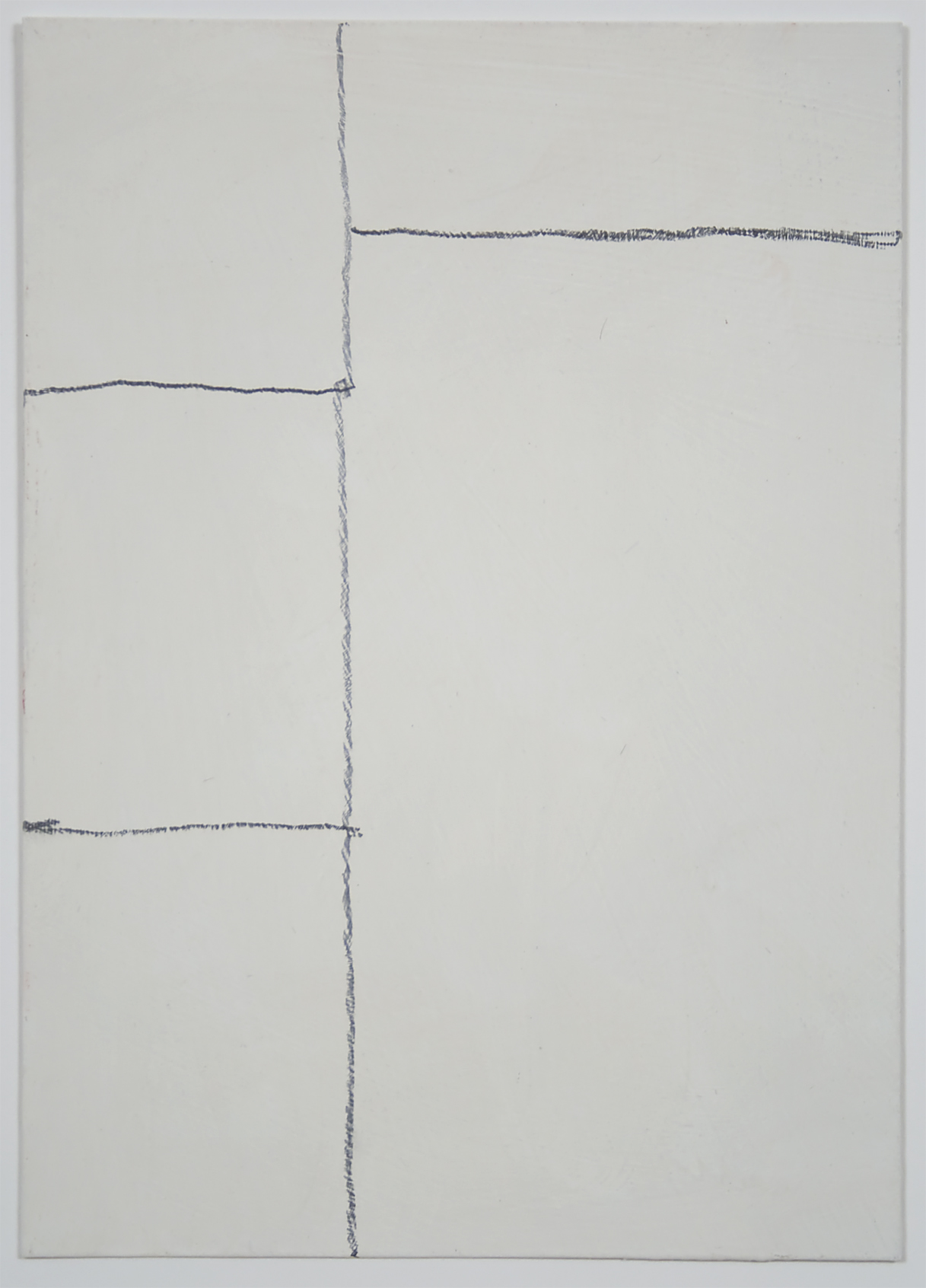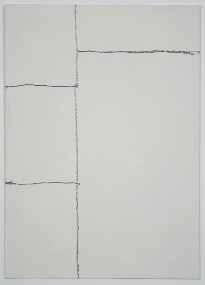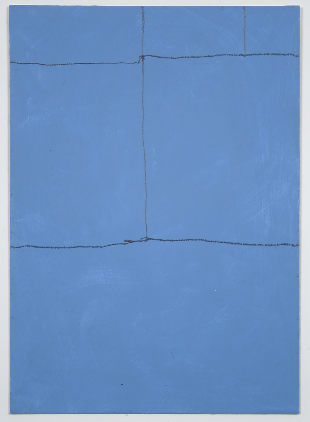 The drawings consist of four simple but mysteriously compelling compositions of horizontal and vertical lines intersecting at right angles, drawn freehand on standard-size postcards. The background colors of the postcards deepen gradually from off-white to slate blue-gray to a rich cornflower blue to an intense cobalt. The play of asymmetrical horizontals and verticals in the drawings varies subtly but markedly, each offering a different dynamic of just four lines in the first three images and of five in the fourth. The dominant vertical line shifts from the left in the first drawing to the right in the second, each with three horizontal branches extending to the outer edge of the postcard. The third drawing presents two equal horizontals that traverse the width of the card, supporting two shorter verticals, with an empty space occupying almost the entire lower half. A greater equilibrium in the length and placement of lines and in the areas that they define is achieved in the fourth drawing, giving a sense of unequal, opposing forces held in balance. The drawings’ depthless picture planes read either as lines precisely arranged on a field or as a field divided into irregular but complementary tesserae.
