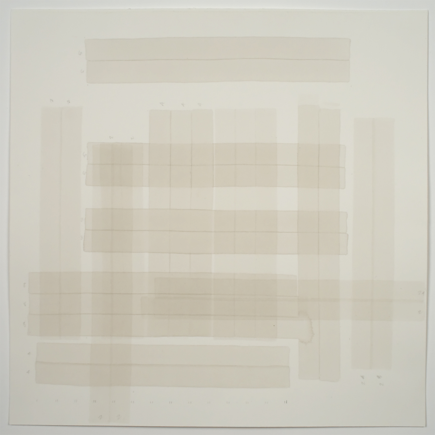 KS: Sure. The laid paper I’m working with is made on a mold, with a mesh of very fine wire ribs. The resulting paper is embedded with a perpendicular grid that looks like books on bookshelves. That laid texture intrigues me—maybe because it reminds me of Agnes Martin’s grids but also because it’s a clearer texture than you can see in wove paper. Papermaking molds for wove paper have a very dense, interlocking wire structure, which results in a more uniform, allover texture.