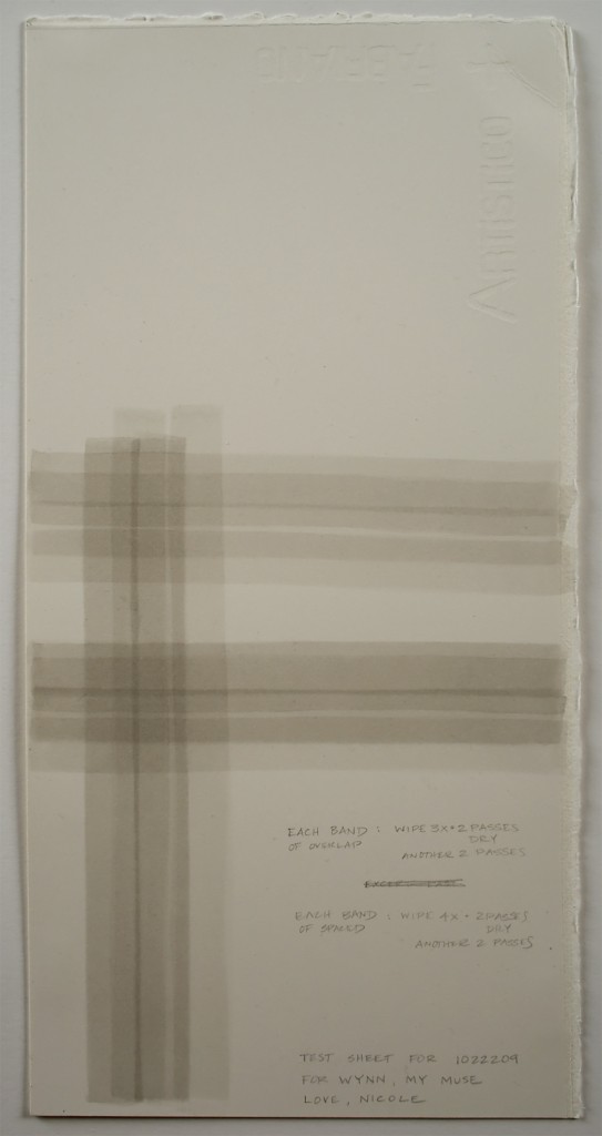 I should say also that this is machine-made paper. I use only machined papers in the Laid Line drawings; I don’t use handmade papers. I have a sense that daily, seemingly boring materials are actually quite unusual the more you look at them. These machine-made papers, which try to be so regular in their manufacture, actually contain surprising details. The more we look at our daily surroundings, the more surprised we might be.