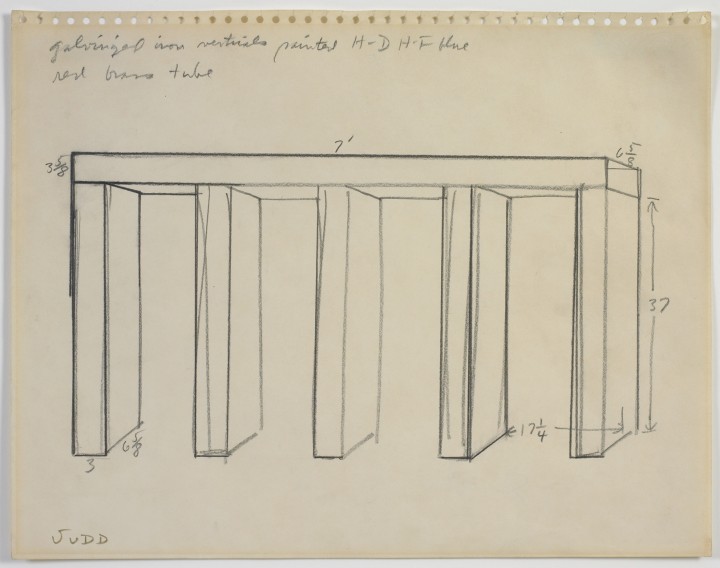 Donald Judd was one of the leaders of Minimal art, both as an artist and as a critic. His sculptural works, which he labeled “specific objects” in a seminal essay published in 1967, were characterized by streamlined large-scale geometric forms produced using industrial materials and processes of fabrication. Judd’s untitled sketch, also from 1967 (fig. 1), is a working drawing for one of a series of sculptures that he began producing in 1965. Each nearly identical object in the series consisted of a horizontal bar with five verticals, yet each displayed slight variations in materials and colors. The schematic work on paper includes handwritten notations for color and material, along with precise measurements for each plane of what Judd called “the brass with five verticals.” The drawing demonstrates the artist’s graphic distillation of “above all that shape.”1