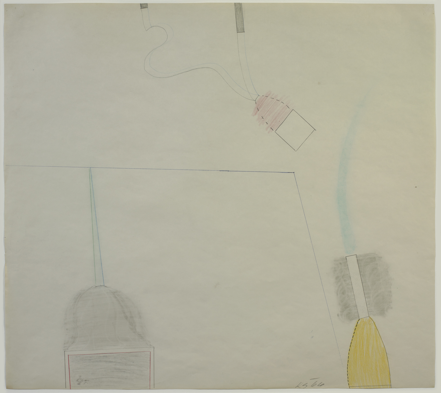 By the late 1960s Sonnier had gained recognition for his playfully exuberant “drawings with light”—sculptural installations using neon tubes and other industrial materials suffused with sensuous color—but conventional drawing on paper is not so readily associated with his practice. This early example is a revealing document of his thinking during a particularly formative year.2 The sheet is a diagram for a light installation using colored lamps, but it betrays a playful subjectivity foreign to most Minimal artists’ drawings of the same period. Using colored pencils and graphite, Sonnier depicted three light fixtures of different types and colors, suspended in an undefined space: a red tulip-shaped fixture with a white collar; a yellow tulip-shaped fixture without a collar; and a gray fixture with a wide rectangular mouth, possibly a floodlight. All three are connected to what may be power cords, tubes, or something more atmospheric, such as air or beams of light. The spatial relationships among the drawing’s elements are ambiguous, however; it is not clear whether we are looking down on the installation from above or up at it from below. The red light apparently has a double tubing, and its serpentine curves inject a sensuous vivacity into the composition. The yellow lamp is positioned at the end of a shallow blue arc, and the gray fixture is either suspended by a straight blue component from an obliquely angled frame, indicated by a simple pencil line, or possibly sitting on the floor. (Sonnier began to experiment with low, floor-based assemblages around this time.)