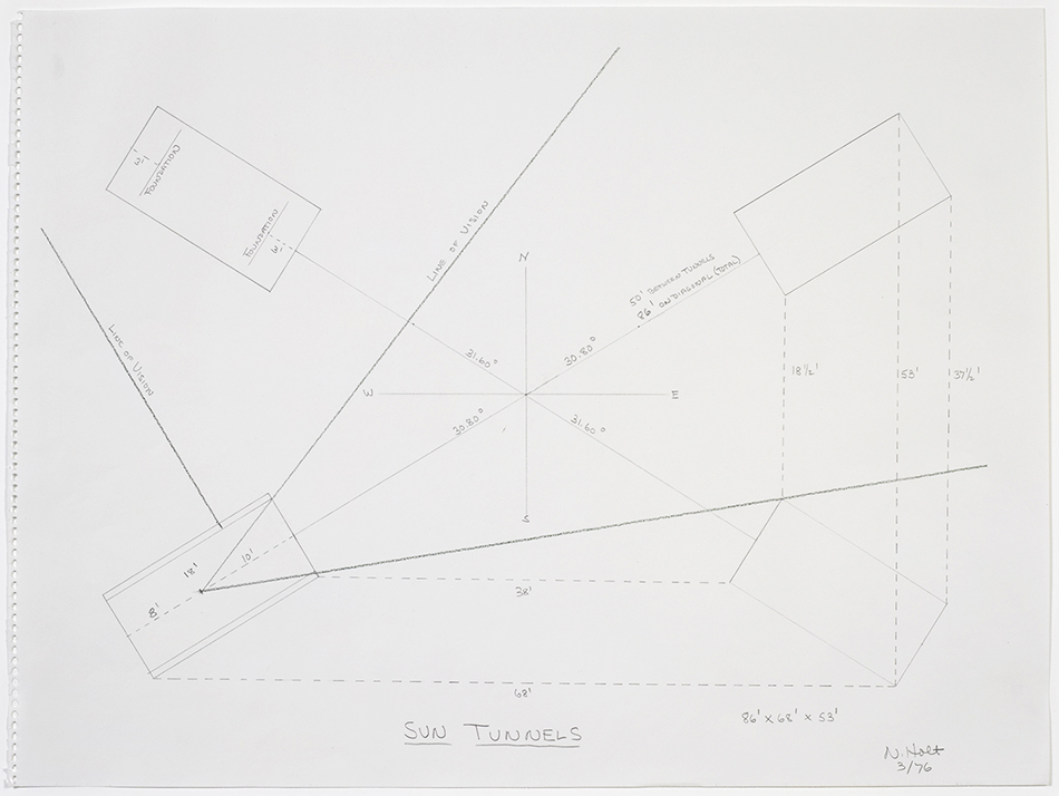 Holt’s construction drawing presents an abstracted vision of the sculpture, not re-creating the experience of viewing it but instead simplifying the sculptural installation into austere diagrammatic forms. In doing so, the drawing represents with mathematical precision the relationships among the work’s elements. The tunnels are indicated by four rectangles, viewed schematically from above as in an architectural plan. The viewer’s potential interactions with the objects are indicated by three straight lines, each marked “Line of vision,” projecting from the tunnel in the lower left corner of the sheet. She also noted the distances between the tunnels with dotted lines. Further expanding the context in which the tunnels are oriented, Holt registered their placement with respect to the cardinal directions, with two intersecting lines at the center of the drawing forming a compass marked by letters for north, south, east, and west at the respective endpoints. Two angled lines intersect this compass, indicating the axes along which the tunnels are placed; each line is marked with a notation of its degree of rotation from the cardinal axis, either 30.80˚ or 31.60˚.