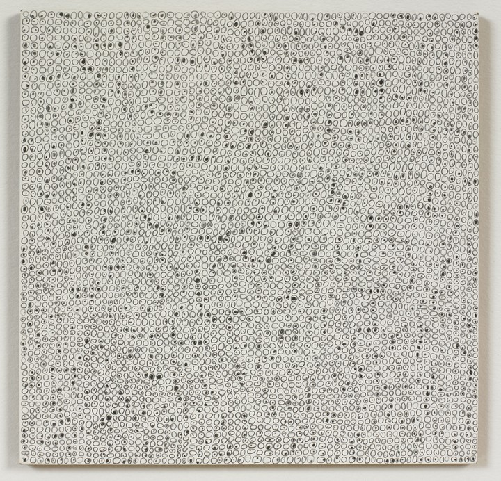TG: I would start by preparing the surface of the painting. Working with the support flat on a table, I would dissolve a little bit of acrylic enamel in water, and I would make a wash. Then I would apply drops of the wash to the surface with a paintbrush, and I would let each drop start to dry out. Before they were completely dry, I would put a smaller drop of undiluted acrylic enamel into the center of each drop, where a little bit of water remained. Then I would let the work dry completely. I wouldn’t stop until I filled the last spaces with these dots—then I was done.