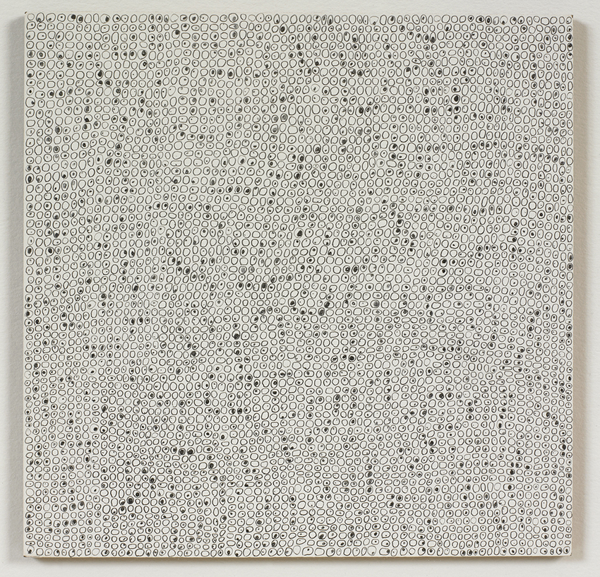 The next step was putting it all together. That’s when I started doing the drops. I began by making freehand drawings of grids of dots—they were very loose. After that I tried drawing a pencil grid on the paper with a ruler. Then I became really purist and decided that if the grid was going to be there, I might as well make it with ink. I’m not trying to hide anything over here. At the beginning I was only working with ink on paper. Next, I discovered how to work with acrylic on canvas. For some reason, it felt very strange to put pencil or pen to a painted surface in order to draw the grid, so I designed a series of contraptions that would float a gridded net of fishing line an inch above the canvas. Then I would use a paintbrush to put the drops into each of the open spaces of the net.